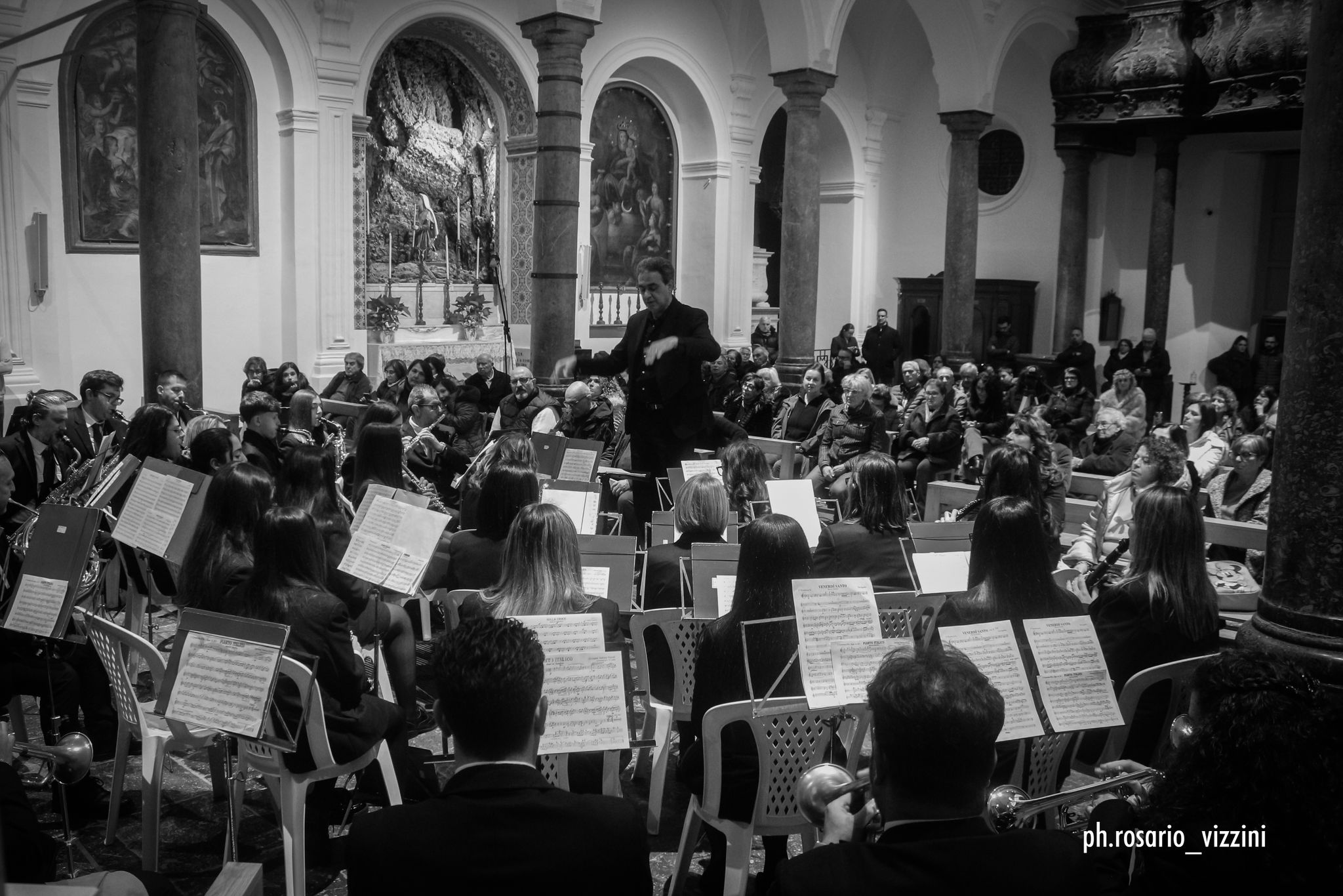 La serata ha proposto un repertorio interamente dedicato alle marce funebri, un genere profondamente radicato nella cultura del Sud Italia e intimamente legato ai riti della Settimana Santa, in particolare alla suggestiva e solenne processione del Venerdì Santo. Spesso relegato, a torto, a un ruolo marginale, questo linguaggio musicale si è rivelato invece, ancora una volta, ricco di valore artistico e umano: autentiche “piccole sinfonie” nate da un’attenta ricerca armonica, melodica e contrappuntistica, capaci di dare voce ai moti più profondi dell’animo.