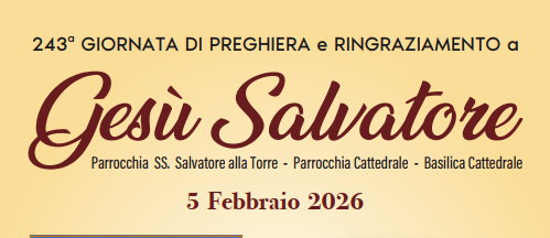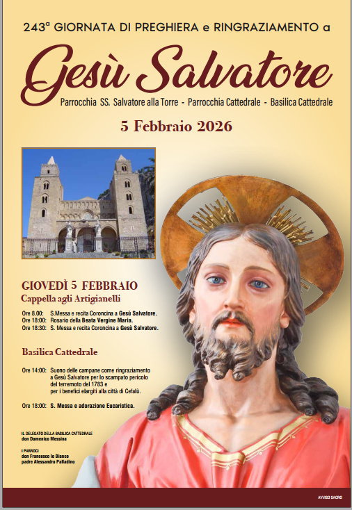 Giovedì 5 Febbraio vivremo la giornata di ringraziamento a Gesù Salvatore per i suoi benefici elargiti alla città di Cefalù.